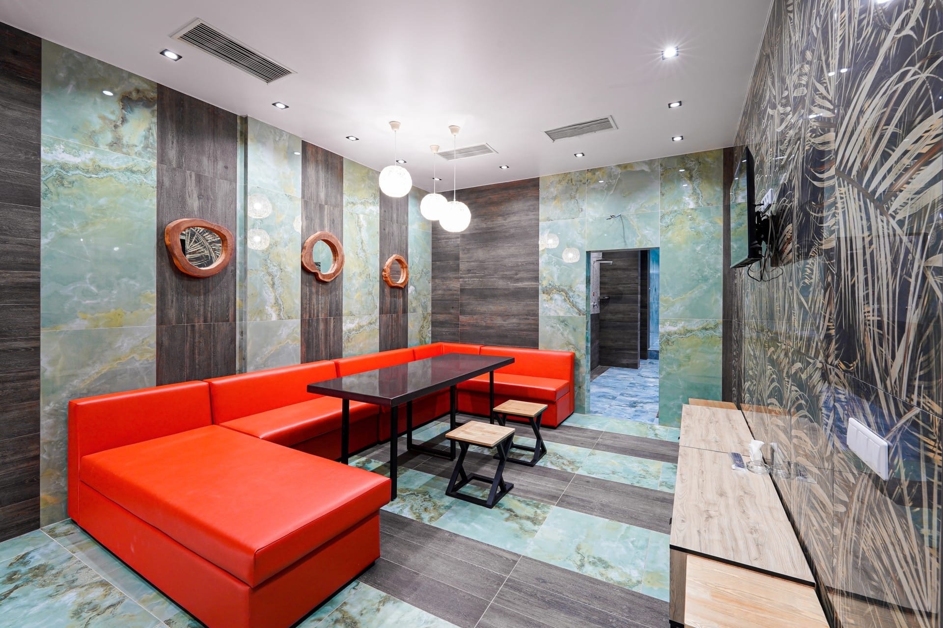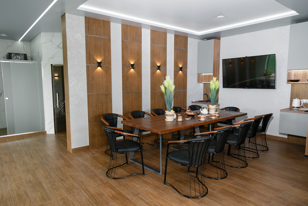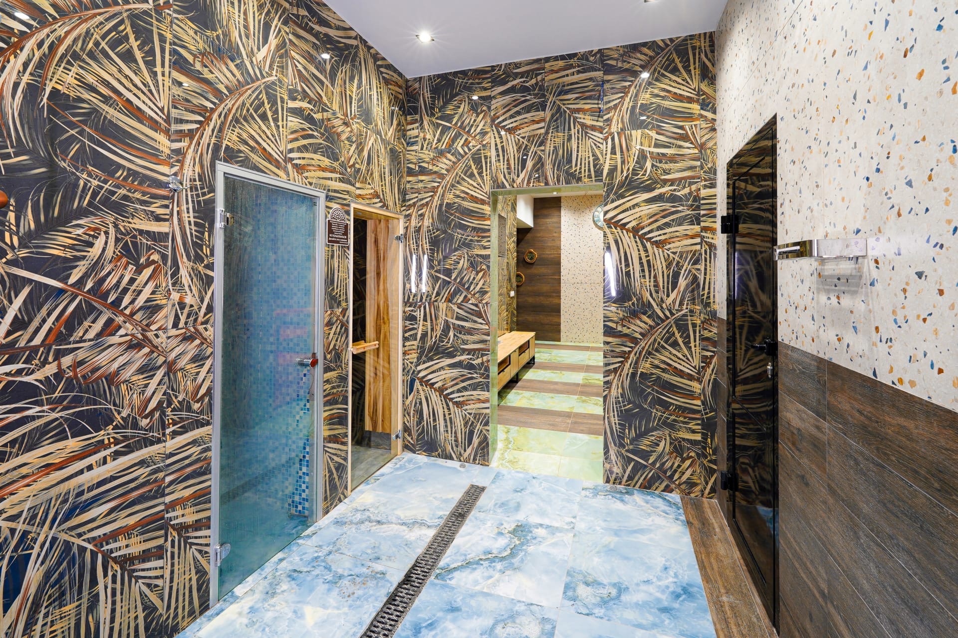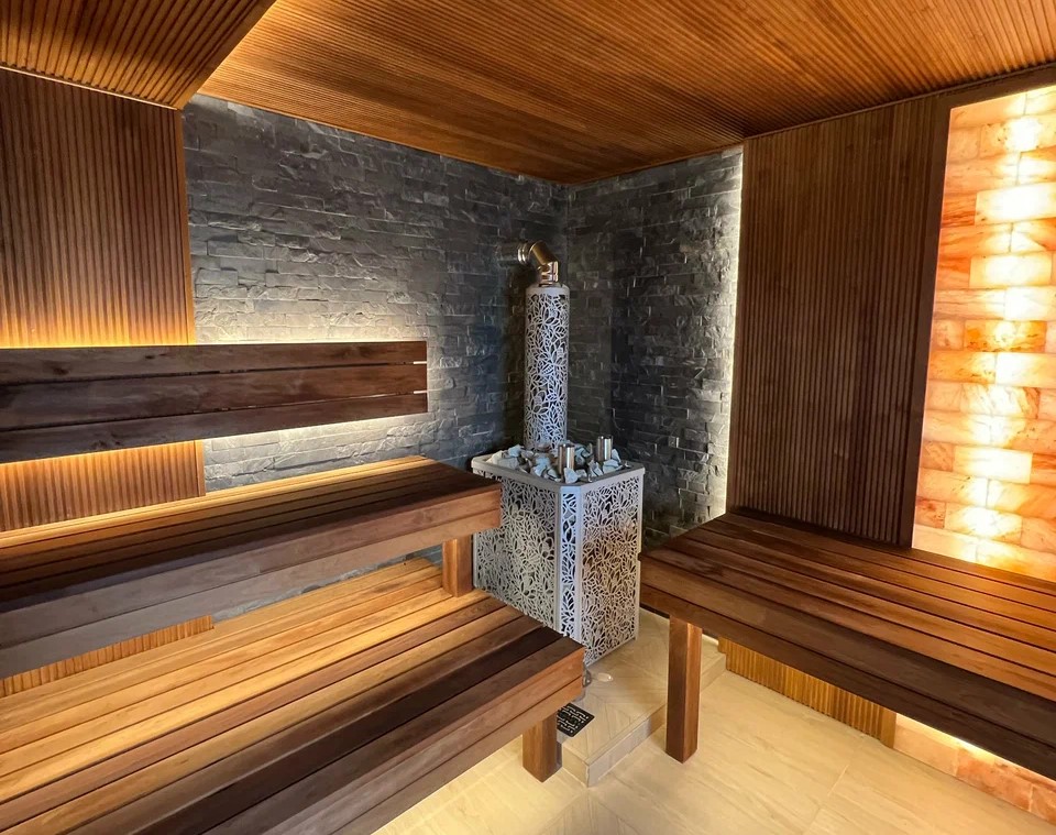 Первая зона выполнена в современном стиле, отличающимся элегантностью линий и утончённым дизайном. Парная оснащена дровяной печью Ялта, которая наполняет помещение мягким паром, способствуя глубокому расслаблению и восстановлению сил. Панорамное окно открывает прекрасный вид на тёплый бассейн.