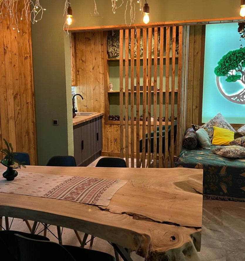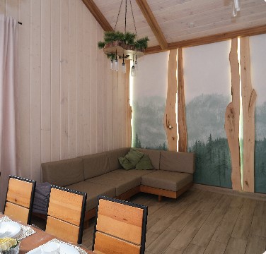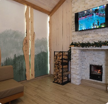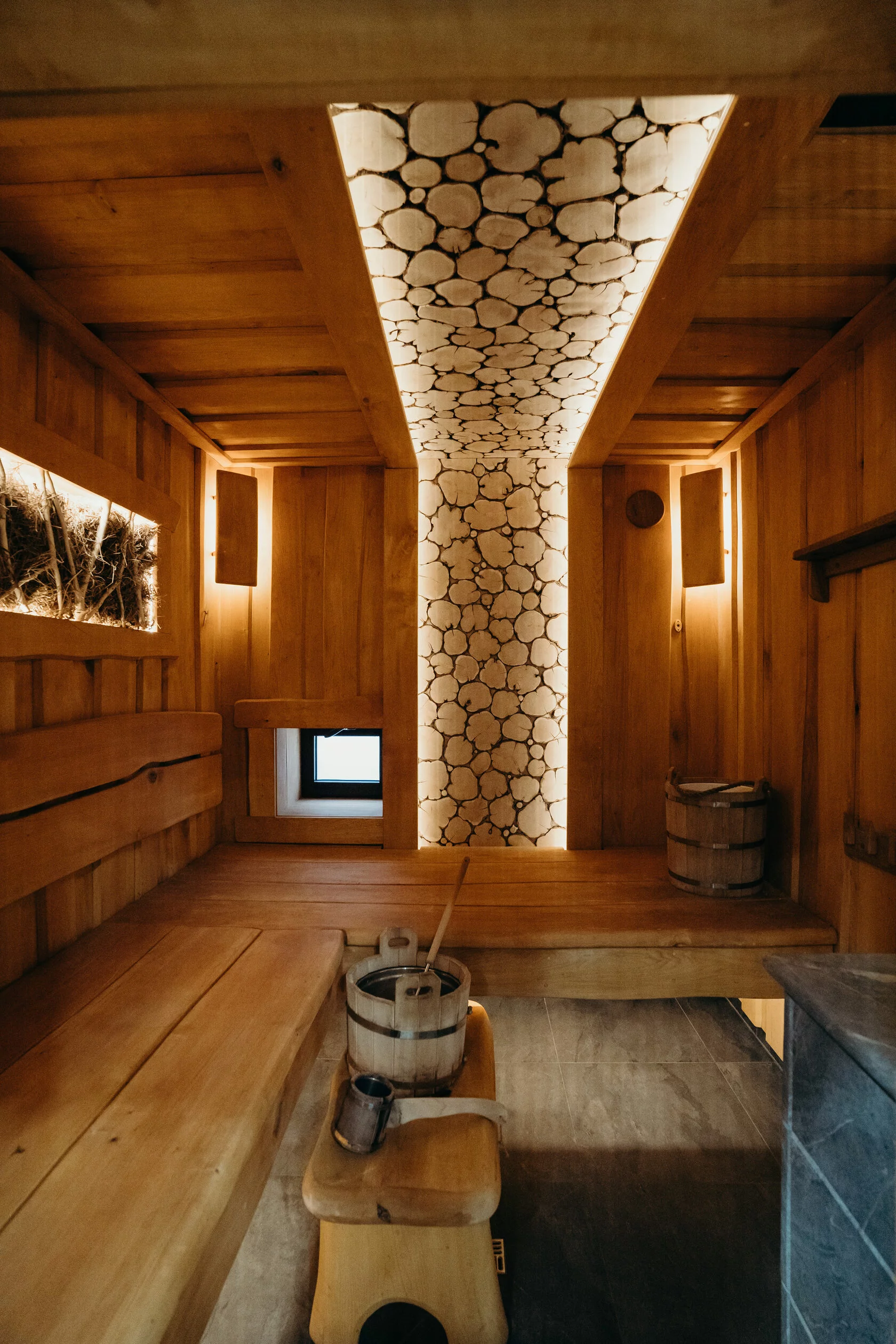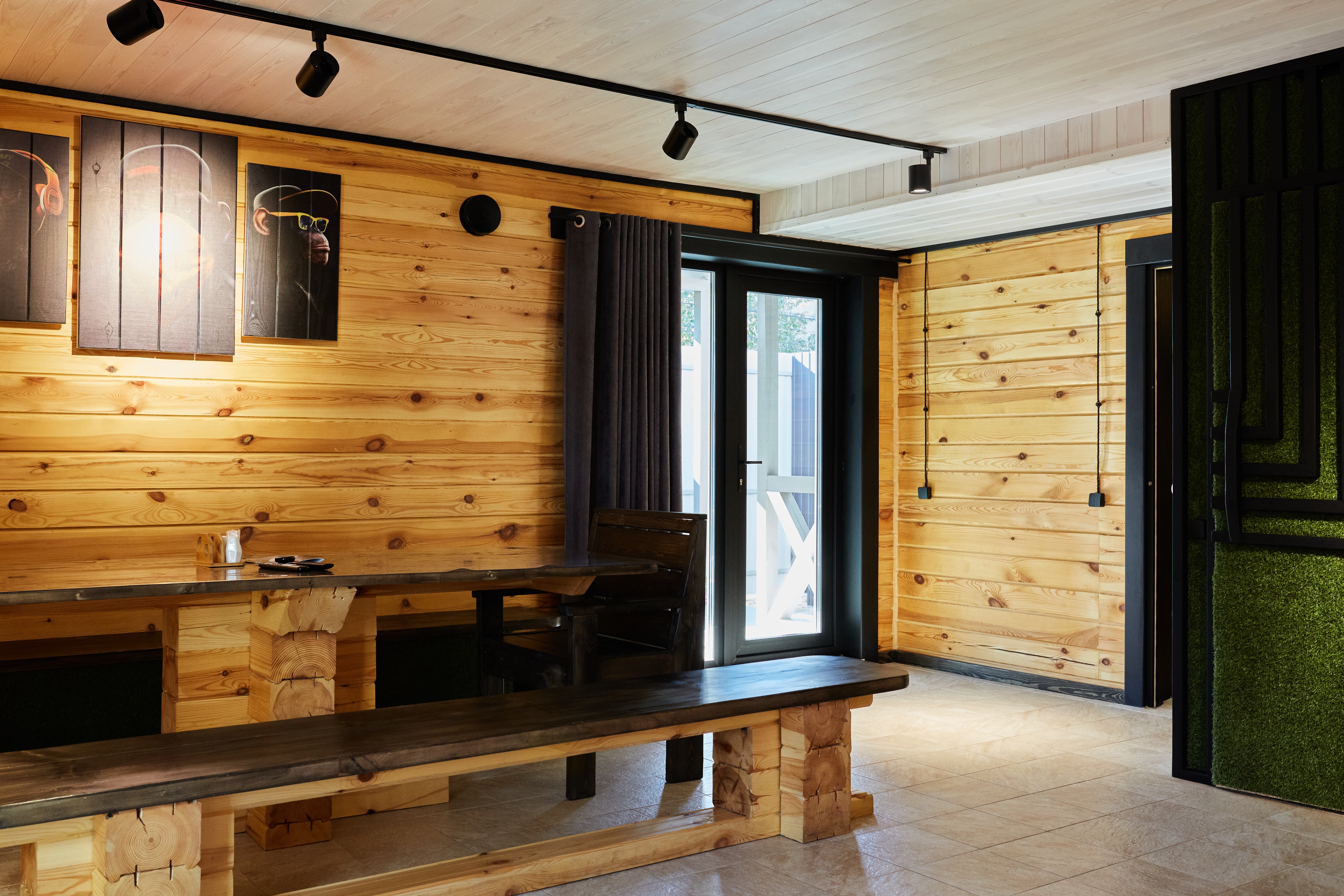 Вторая зона выполнена в стиле «Леший», с использованием необработанного натурального материала, создавая ощущение погружения в таинственный мир дикой природы. Живописный пейзаж и сибирский чан позволяют ощутить гармонию с окружающим миром и обрести истинное умиротворение.