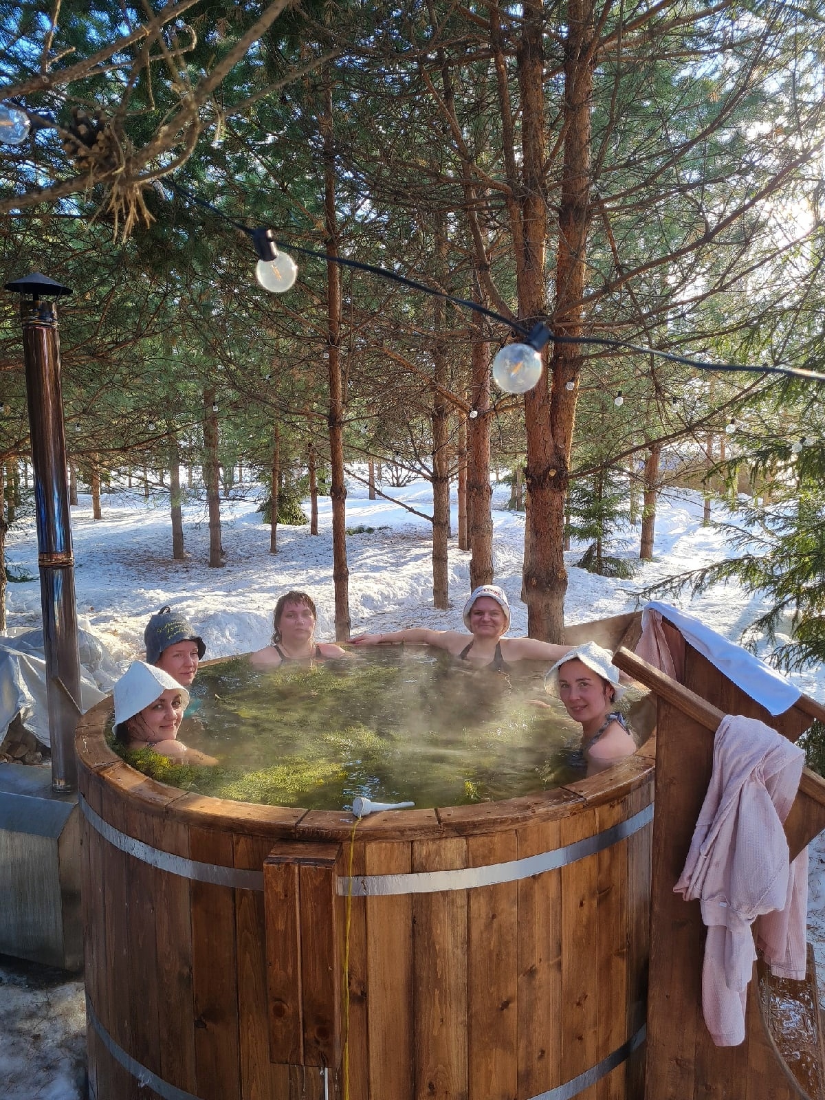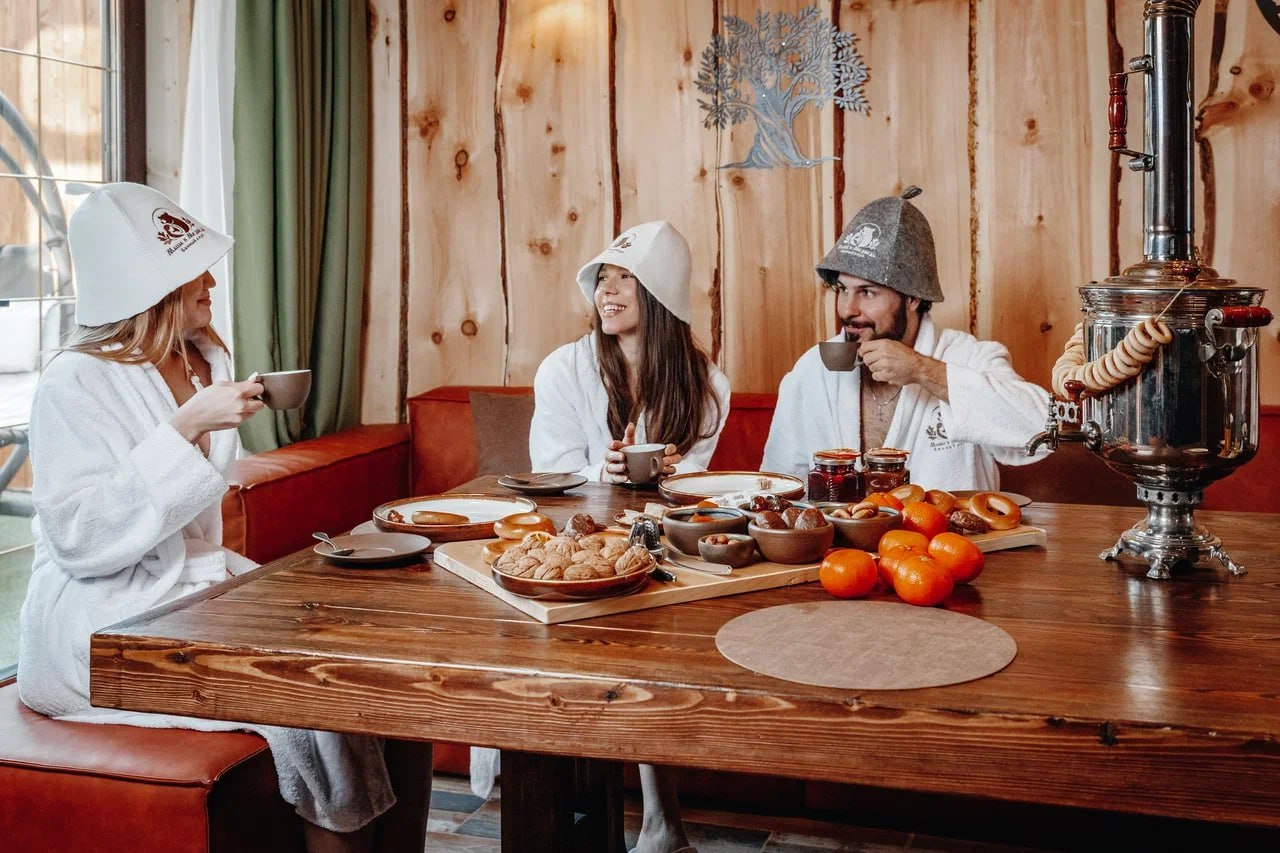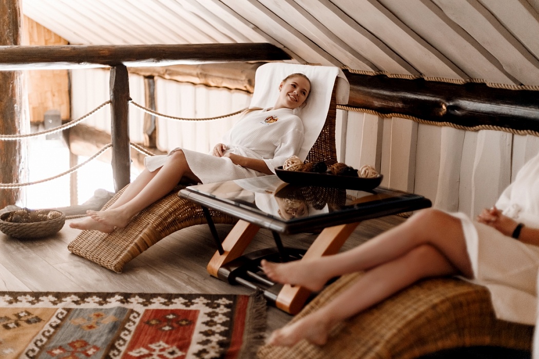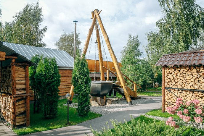 В комплексе уникальные срубы бани с бассейнами и общественный термальный комплекс с собственной кухней. В качестве сопутствующих услуг можно приобрести индивидуальное парение, массаж и прочее.