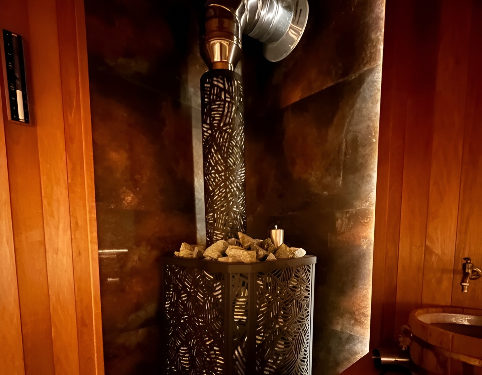 Широкий выбор вариантов облицовки позволит украсить интерьер банного комплекса лёгким резным кожухом-сеткой под закладку камнем