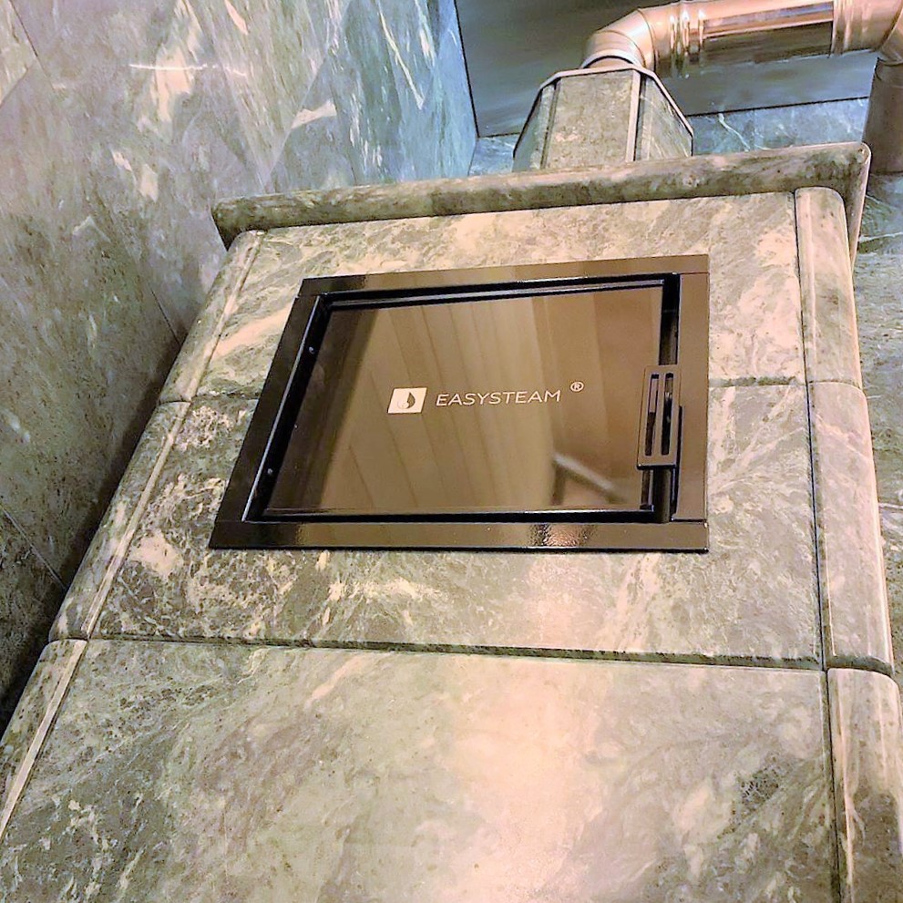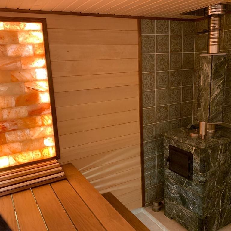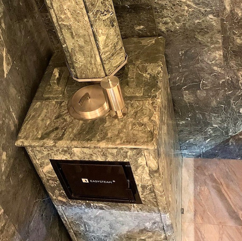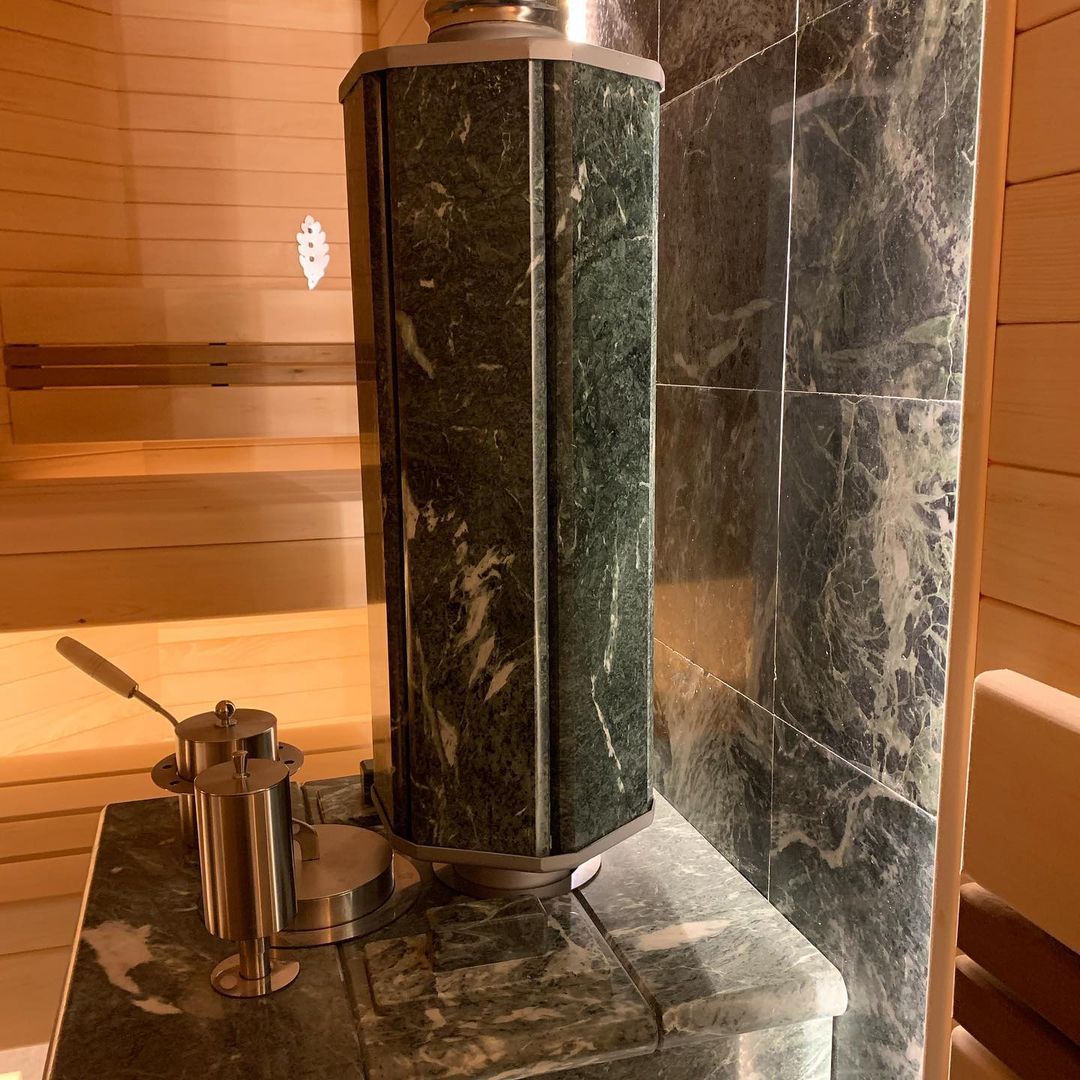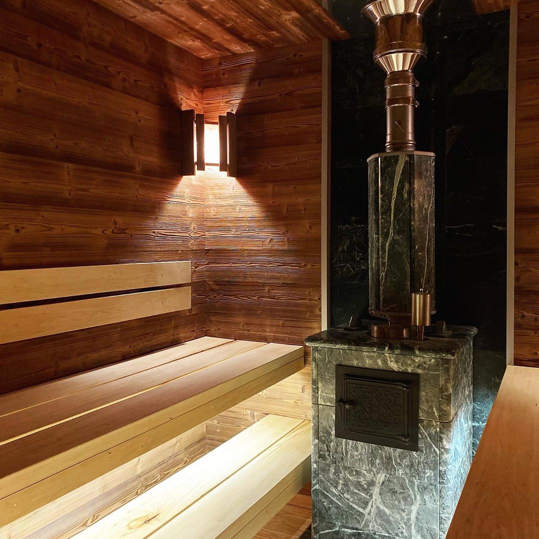 Использование камня в отделке позволяет исключить попадание на поверхность дерева капель горячей воды, за счет этого увеличивается эксплуатационный срок парной.