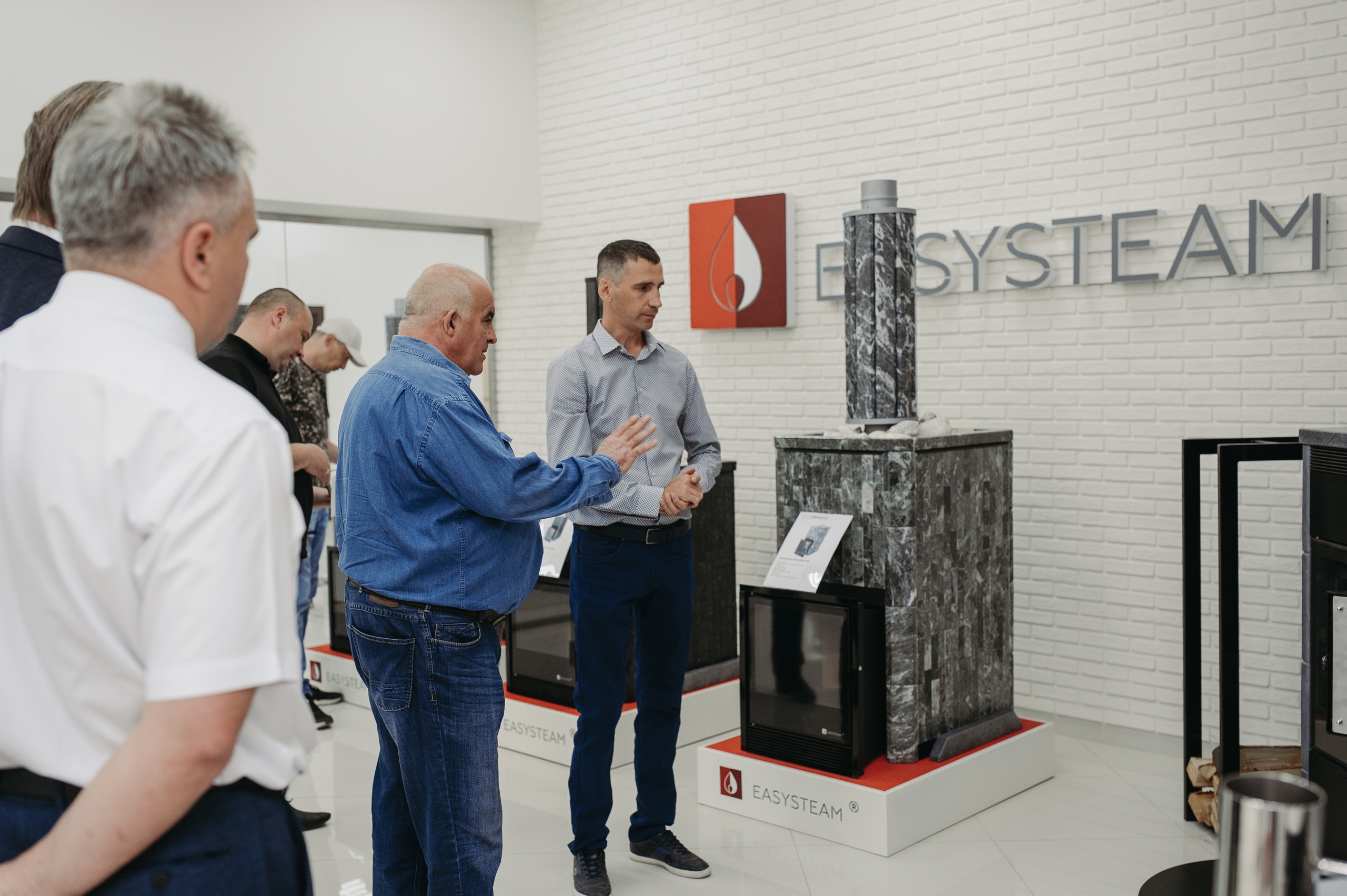 Финал встречи прошел в презентационном зале, где собрана выставка основных моделей печей, дополнительного оборудования и банных аксессуаров, где гости визуально оценили дизайн и стилистику современных печей для бани и сауны в облицовках из натурального природного камня под брендом EASYSTEAM.
