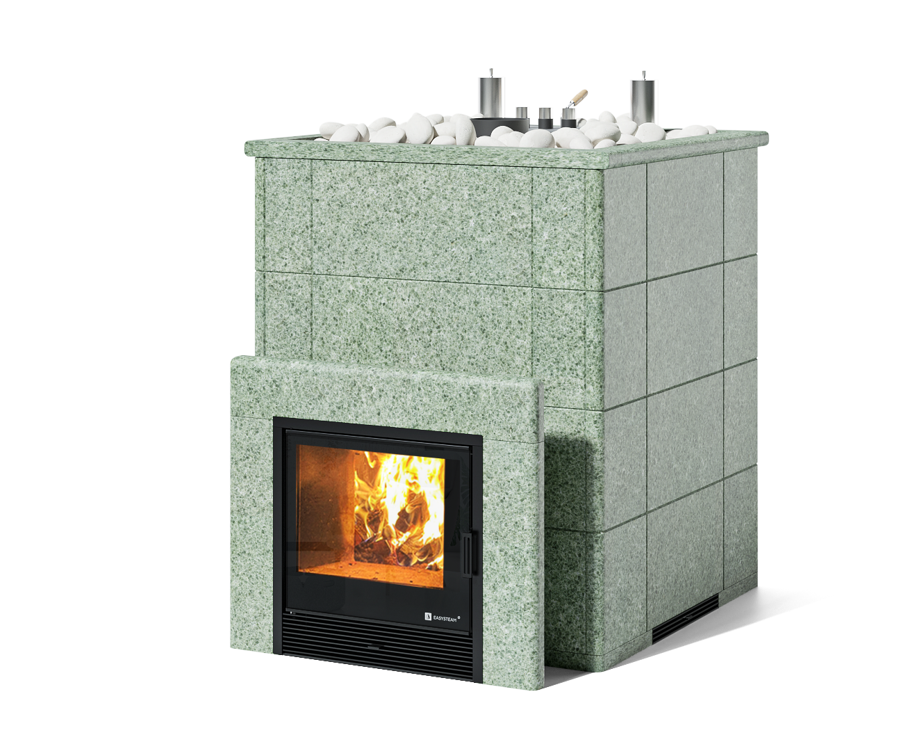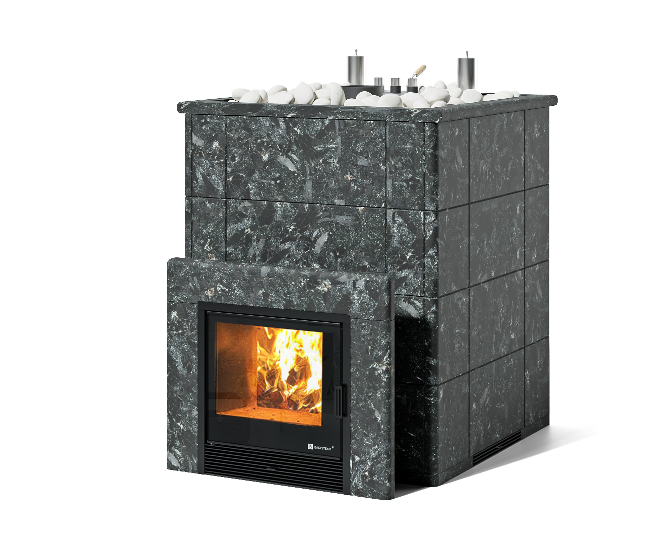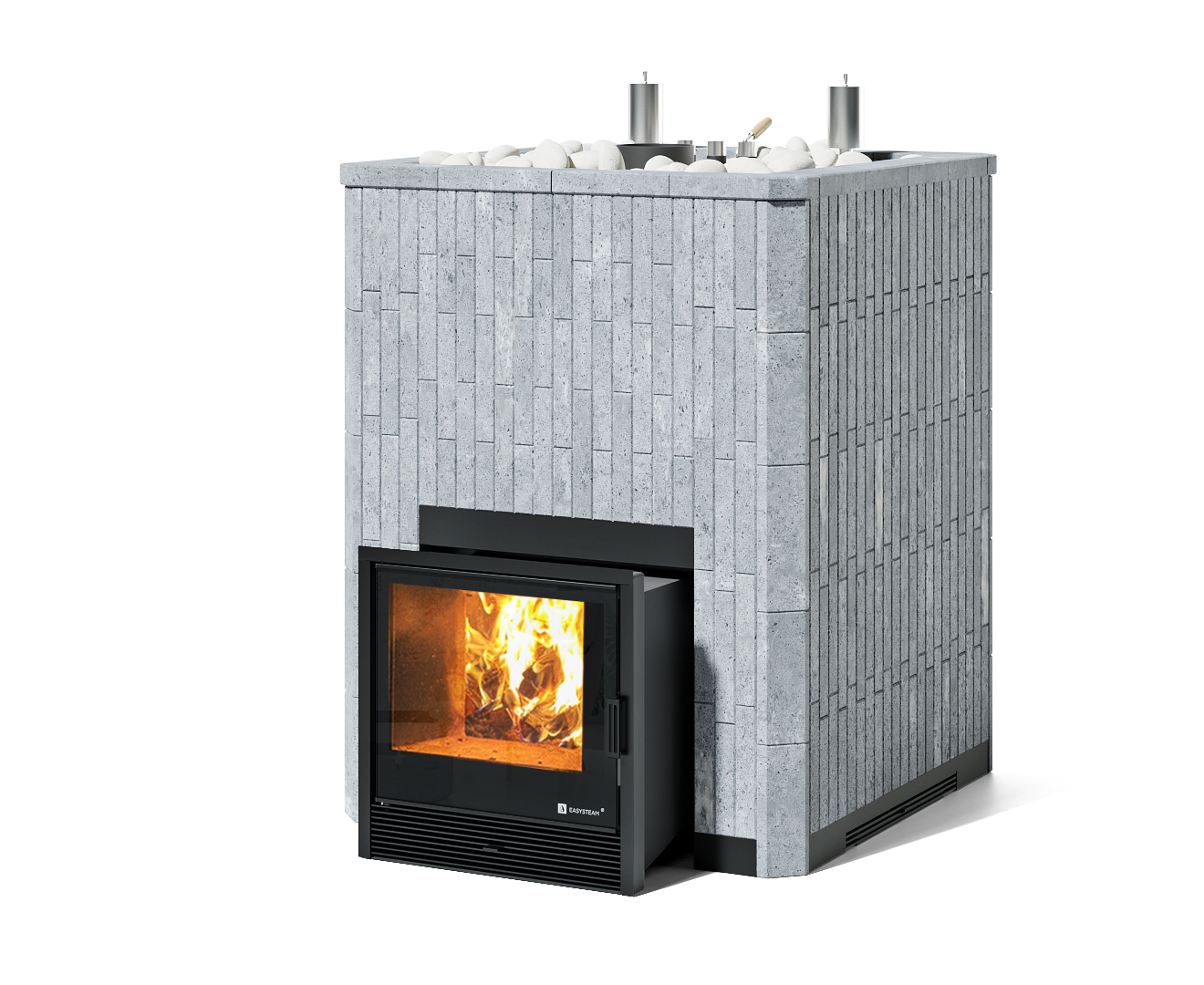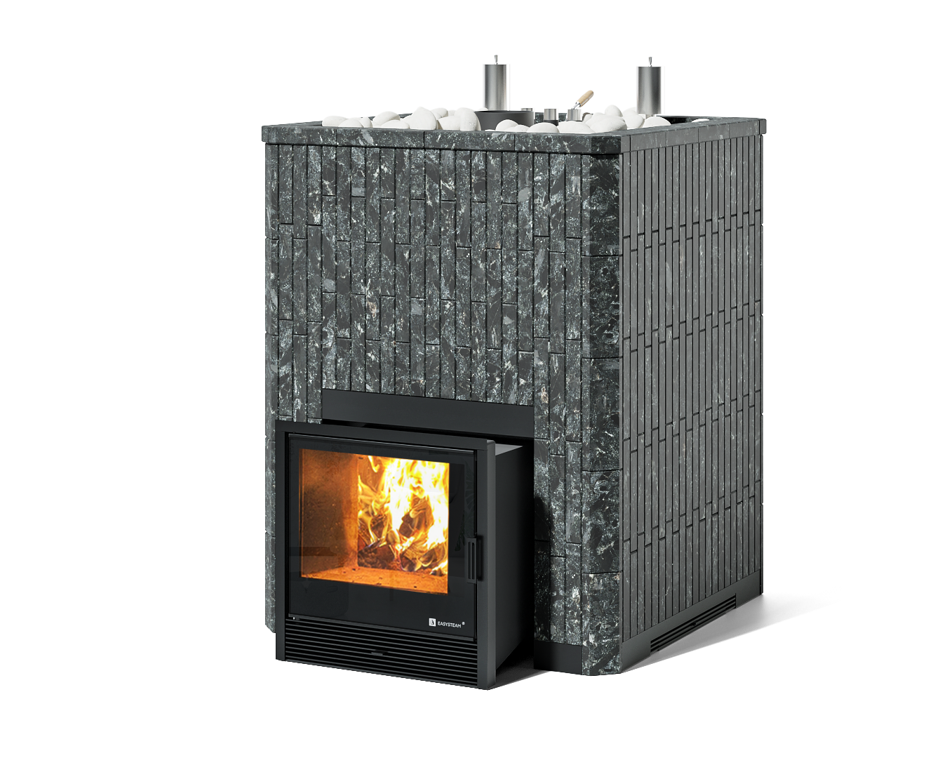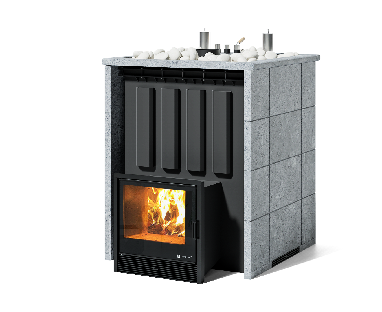 Особо прочная газо-дровяная печь постоянного действия, предназначенная для создания в парильном отделении общественной или коммерческой бани, условий настоящей русской парной, с присущим ей температурно-влажностным режимом. Массивный теплоаккумулирующий кожух позволяет сохранять выделяемое печью тепло и улавливать инфракрасное излучение. Кожух может быть изготовлен из кирпича или в ламелях из четырёх видов природного камня: