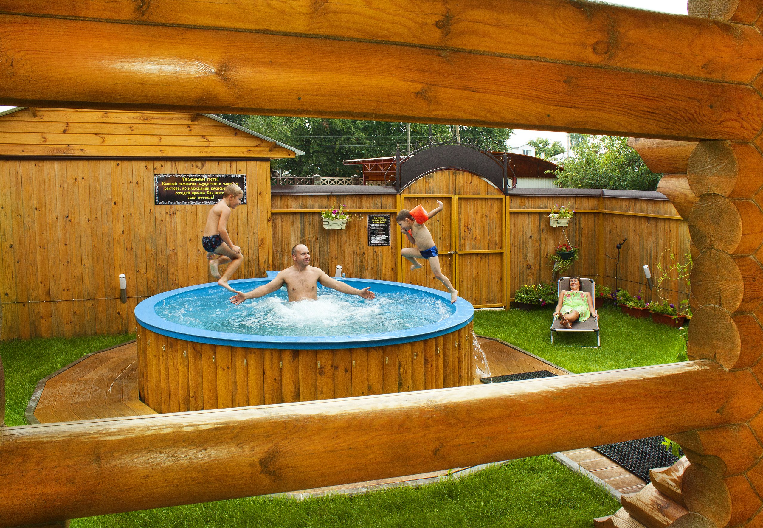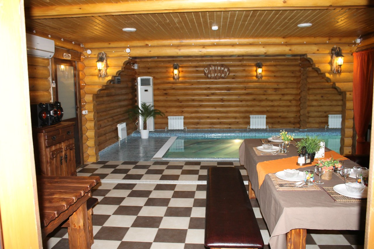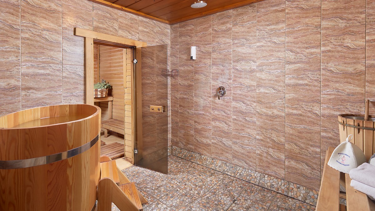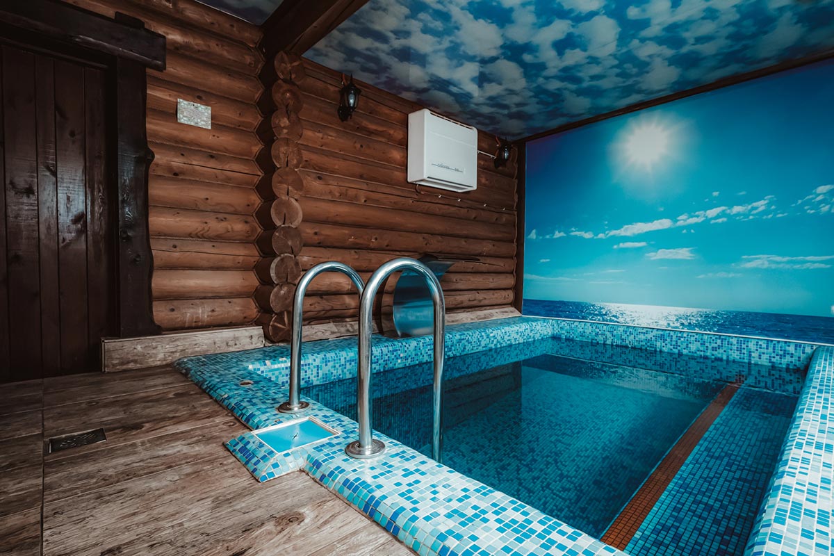 Для гостей оборудована аквазона с просторной помывочной и двумя купелями — с холодной и тёплой водой, что позволяет полностью расслабиться и насладиться водными процедурами. Любители активного отдыха оценят большой бассейн, где можно освежиться и зарядиться энергией.