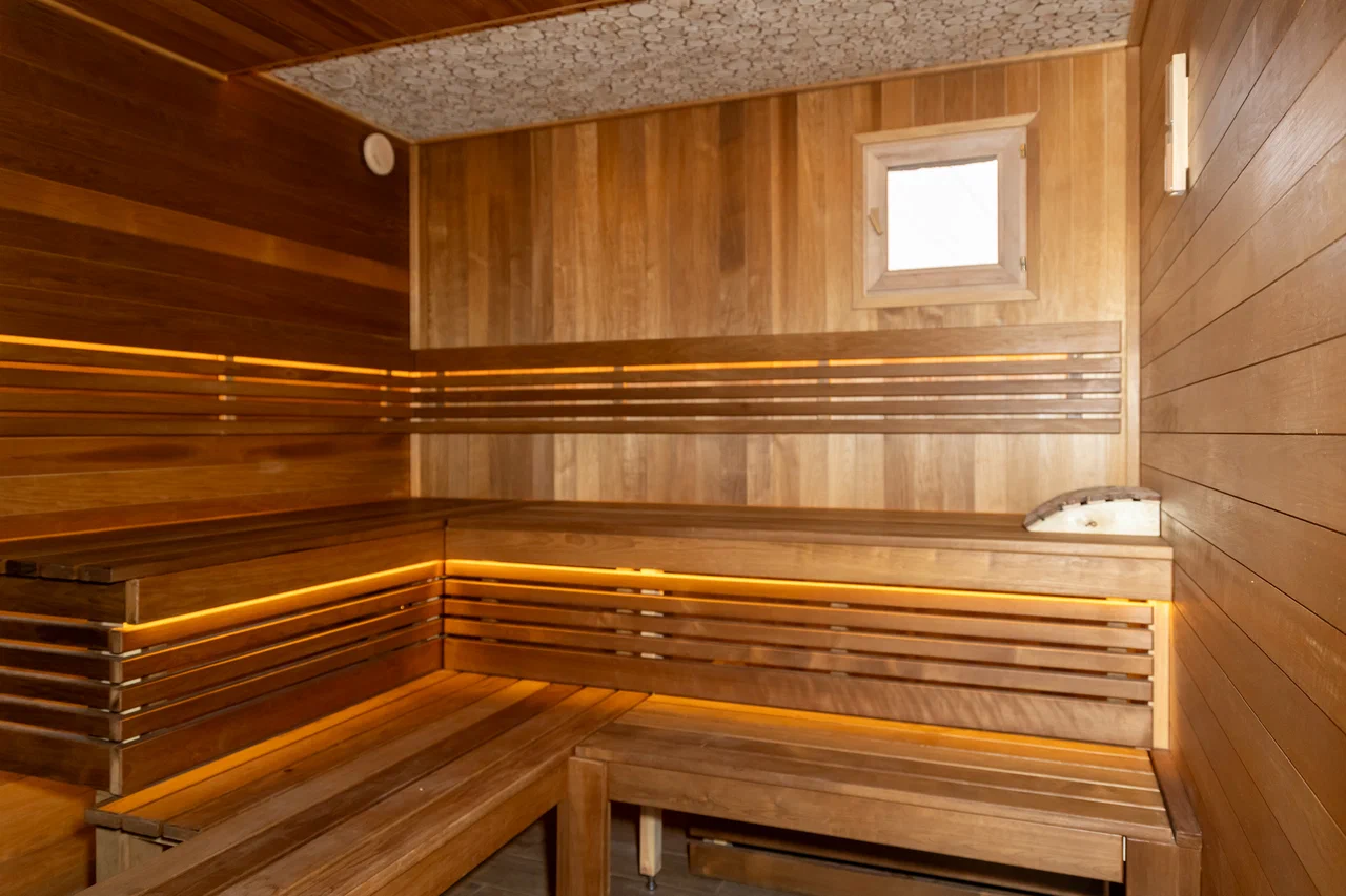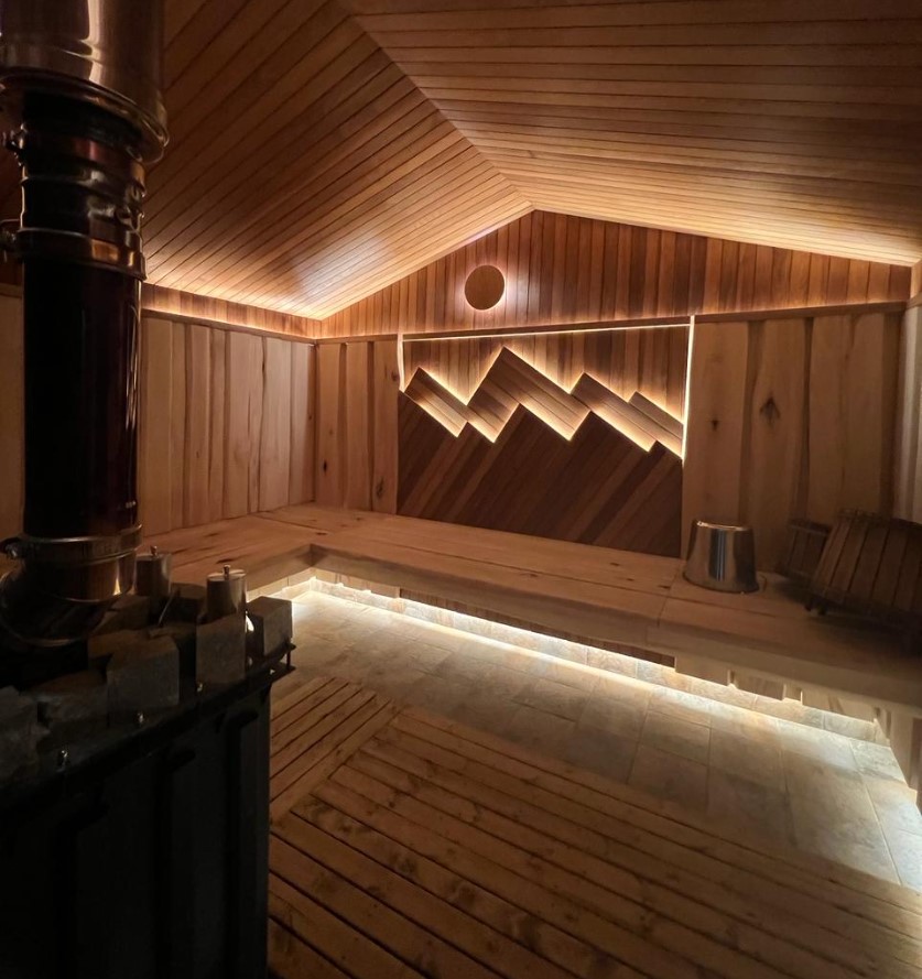 Первая зона выполнена в современном стиле, отличающимся элегантностью линий и утончённым дизайном. Парная оснащена дровяной печью Ялта, которая наполняет помещение мягким паром, способствуя глубокому расслаблению и восстановлению сил. Панорамное окно открывает прекрасный вид на тёплый бассейн.