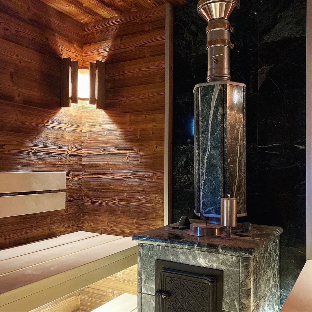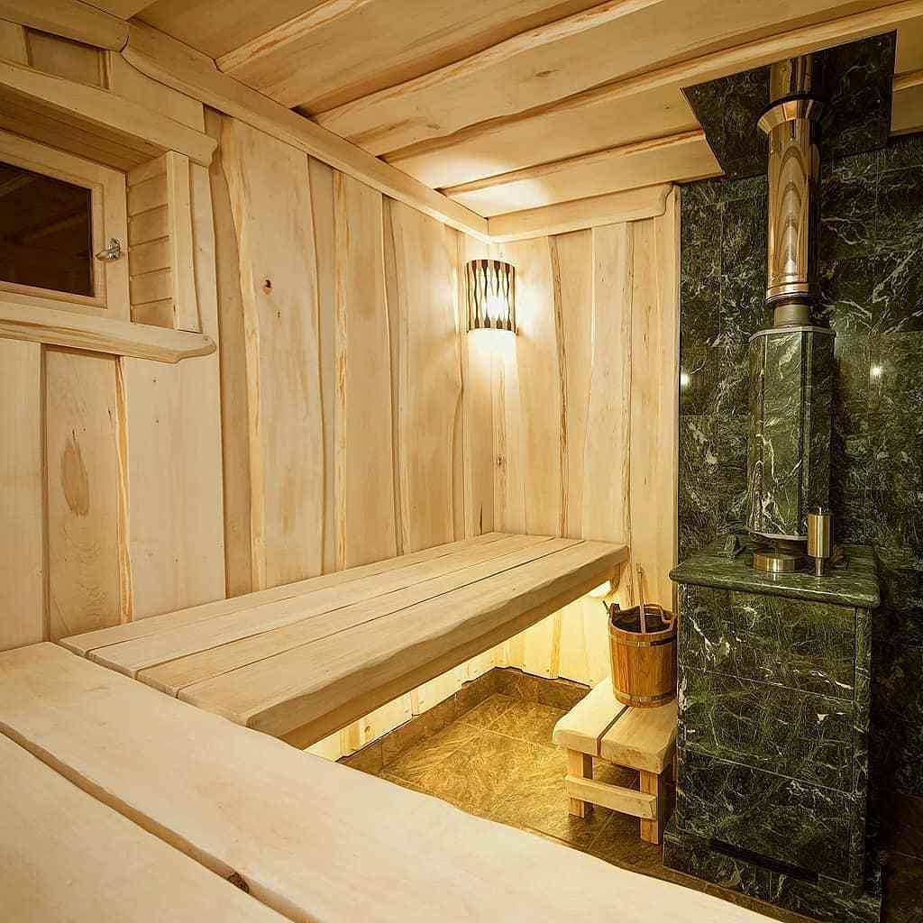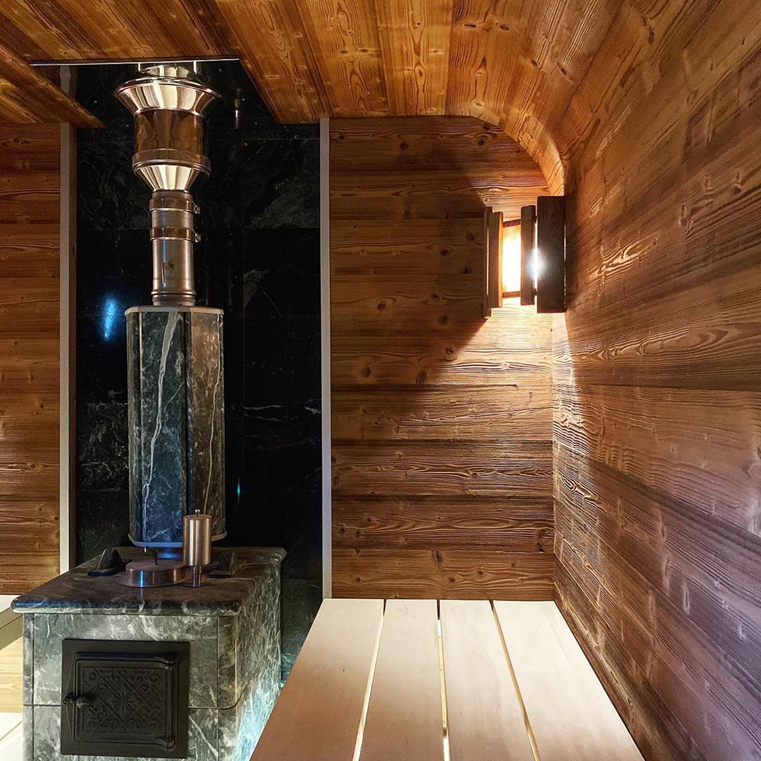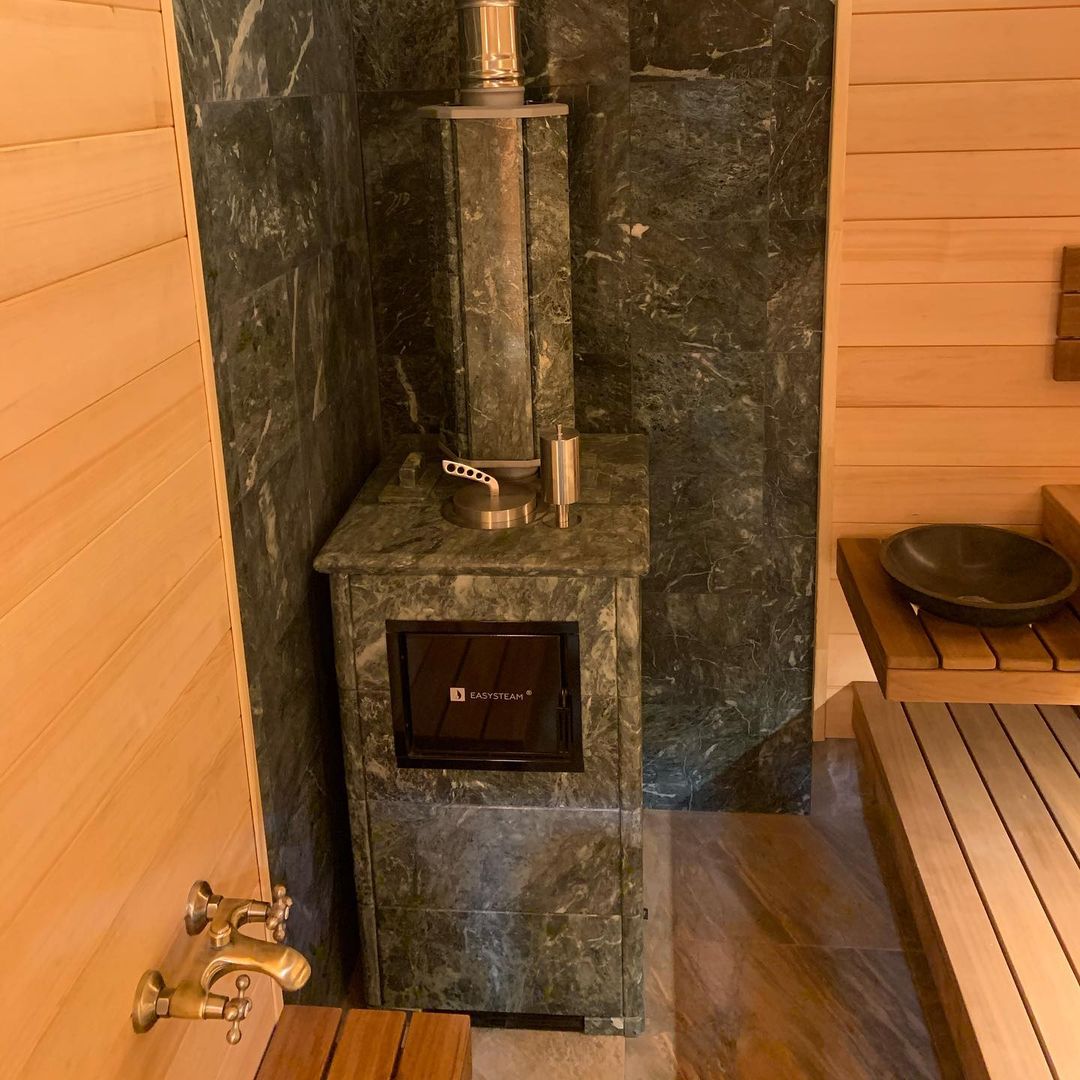 Использование камня в отделке позволяет исключить попадание на поверхность дерева капель горячей воды, за счет этого увеличивается эксплуатационный срок парной.