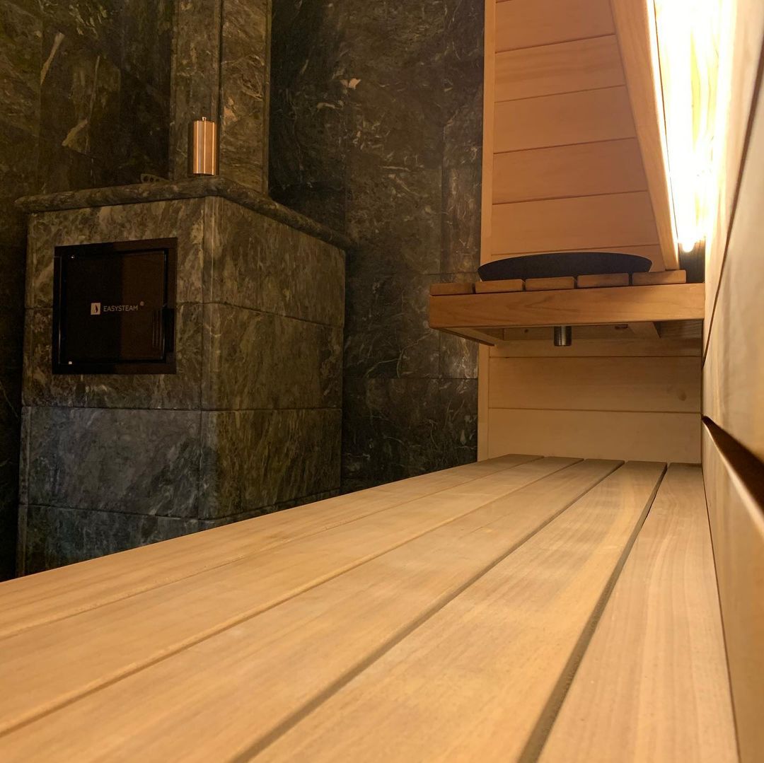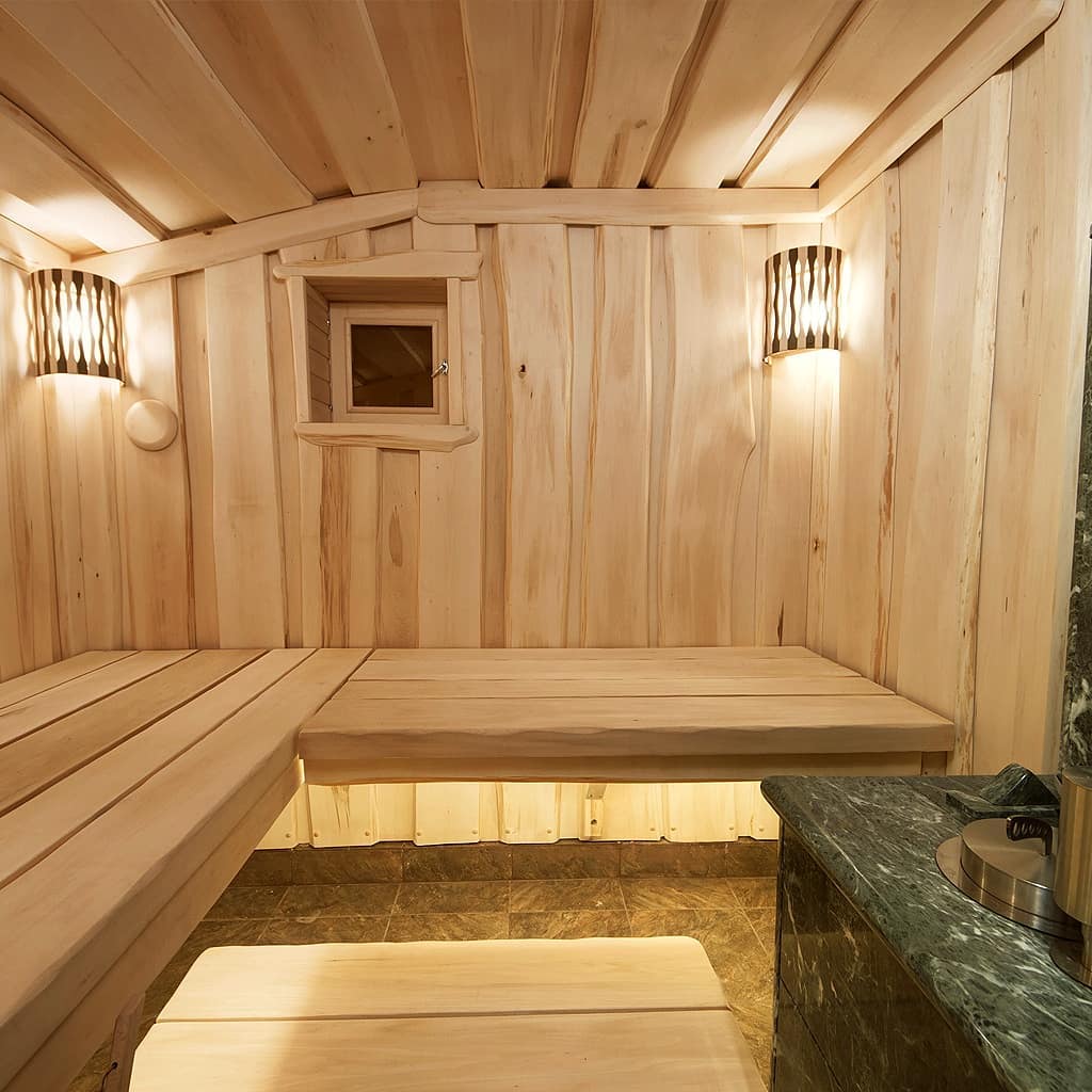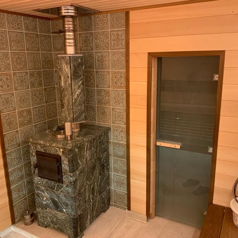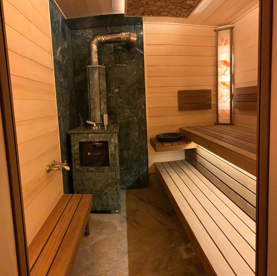 Использование камня в отделке позволяет исключить попадание на поверхность дерева капель горячей воды, за счет этого увеличивается эксплуатационный срок парной.
