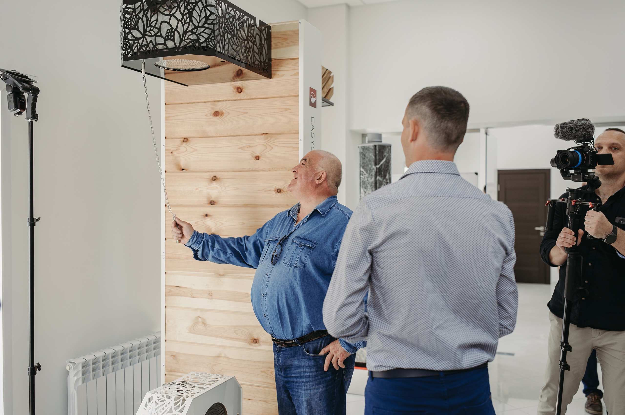 Финал встречи прошел в презентационном зале, где собрана выставка основных моделей печей, дополнительного оборудования и банных аксессуаров, где гости визуально оценили дизайн и стилистику современных печей для бани и сауны в облицовках из натурального природного камня под брендом EASYSTEAM.