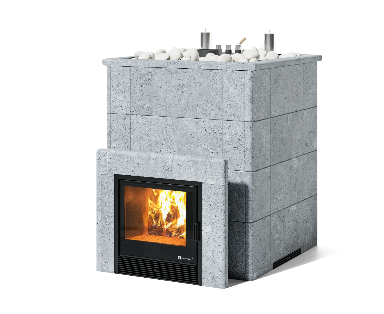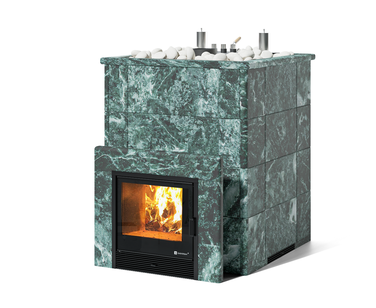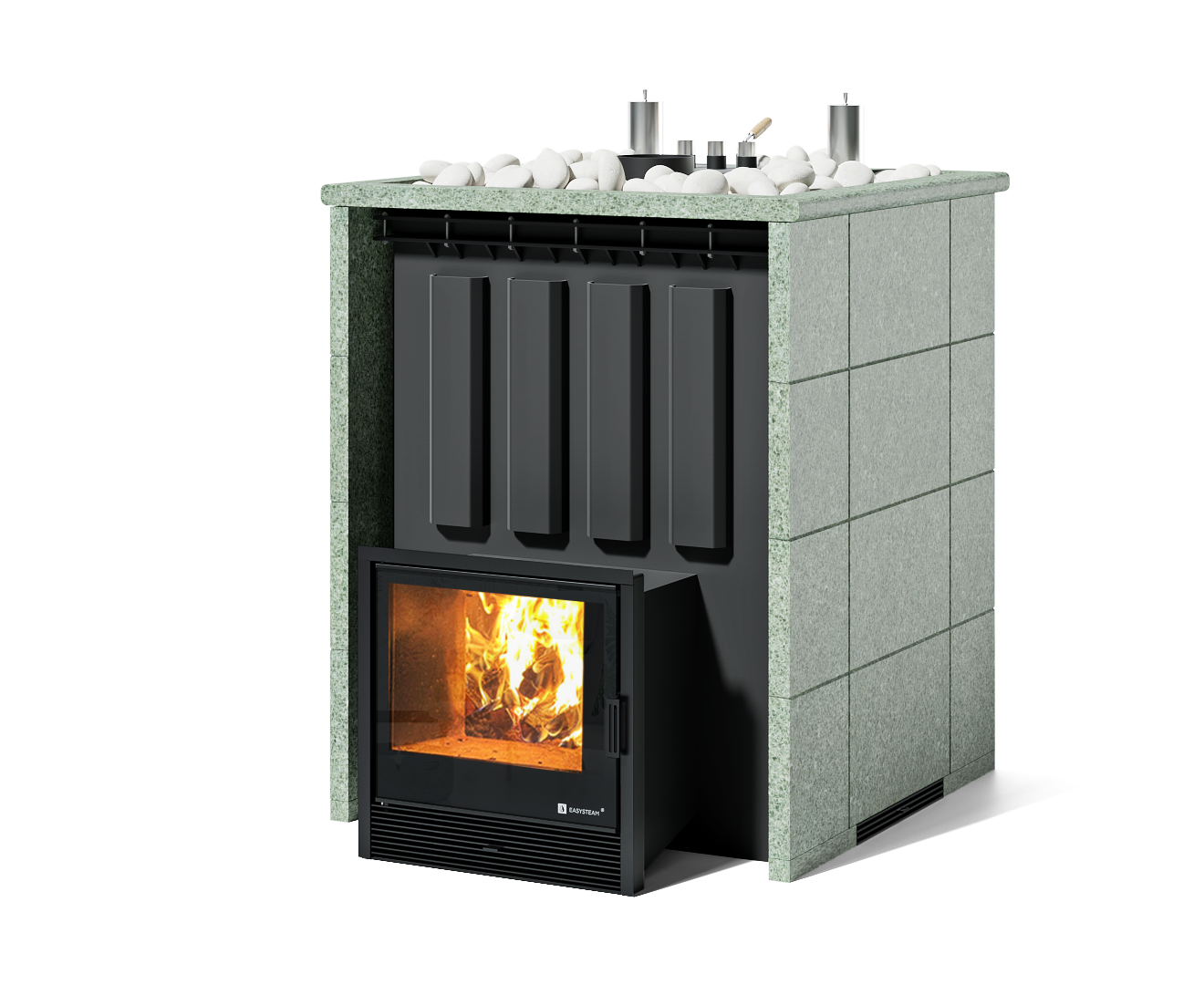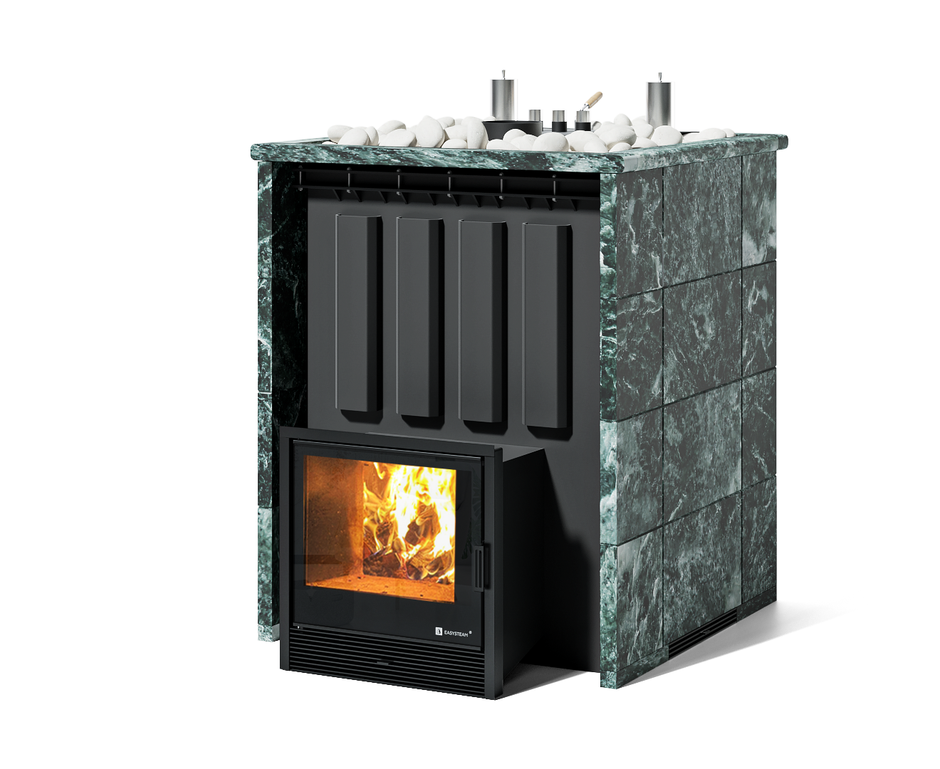 Особо прочная газо-дровяная печь постоянного действия, предназначенная для создания в парильном отделении общественной или коммерческой бани, условий настоящей русской парной, с присущим ей температурно-влажностным режимом. Массивный теплоаккумулирующий кожух позволяет сохранять выделяемое печью тепло и улавливать инфракрасное излучение. Кожух может быть изготовлен из кирпича или в ламелях из четырёх видов природного камня: