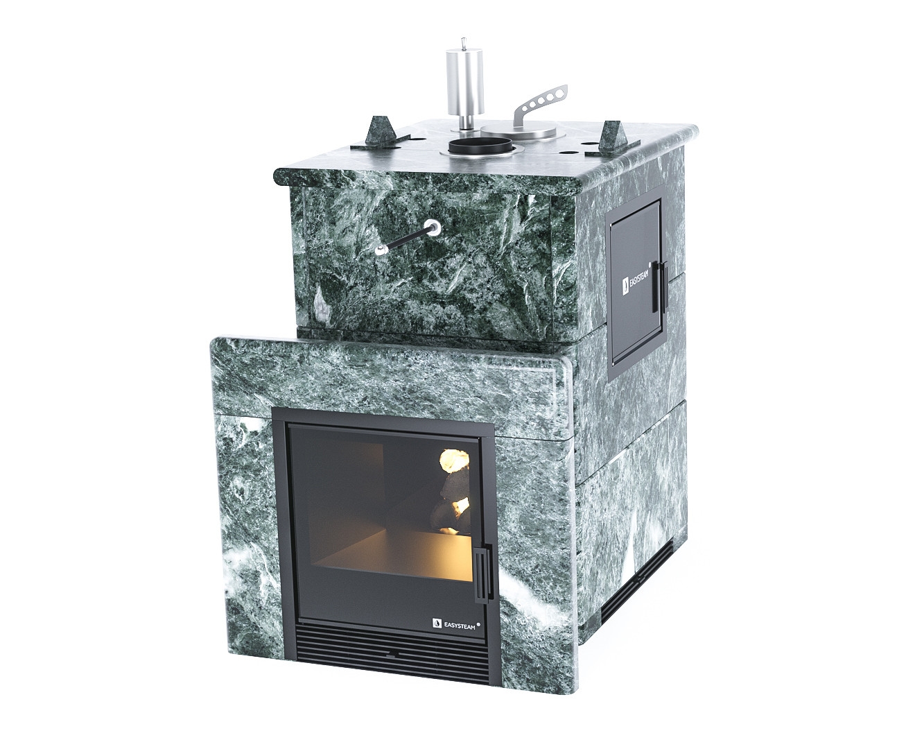 Закрытая каменка позволяет разогреть камни до высоких температур 500-600 градусов, а встроенный парогенератор обеспечивает попадание пароводяной смеси на нижний самый разогретый слой камней, и на выходе получить качественный мелкодисперсный лёгкий пар.