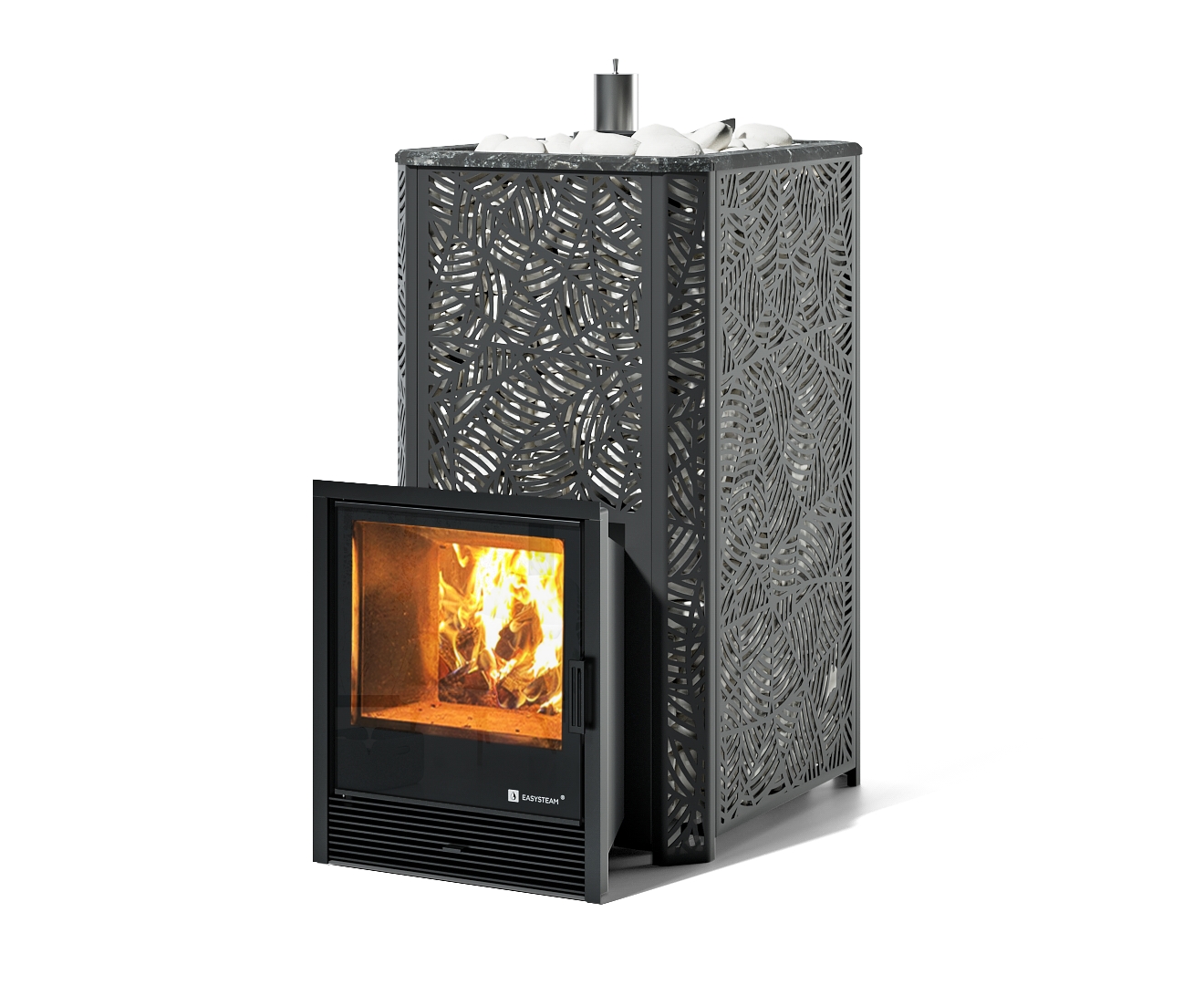 Массивная открытая каменка обеспечивает динамичный прогрев парного помещения и комфортный режим сауны.